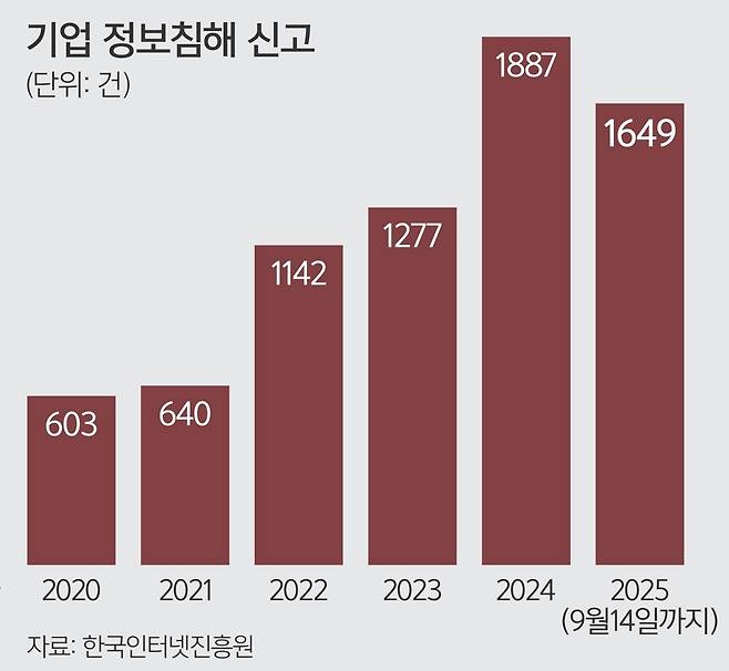 사이버 해킹 피해는 갈수록 증가하는 추세다. 국회 과학기술정보방송통신위원회 소속 더불어민주당 황정아 의원실이 한국인터넷진흥원으로부터 제출받은 자료에 따르면, 2020년부터 올해 9월14일까지 당국에 접수된 기업의 정보 침해 신고 건수는 7198건에 달했다.