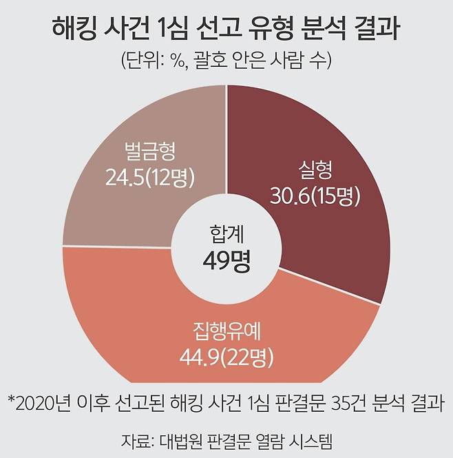 21일 대법원 판결문 열람 시스템을 통해 2020년부터 올해 9월까지 5년9개월간 선고된 해킹 사건 1심 판결문 35건을 종합 분석한 결과, 실형을 받은 피고인은 49명 중 15명(30.6%)으로 나타났다. 정보통신망 침해 사건 중 실제 해킹 범죄가 있었던 판결문만 추려낸 결과다. 49명 중 집행유예는 22명(44.9%)이었으며 12명(24.5%)은 벌금형을 받았다.