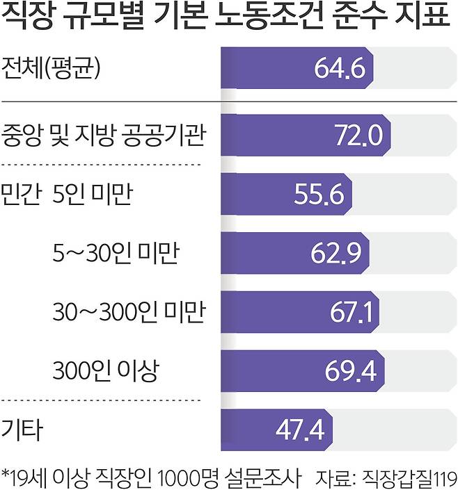 직장갑질119, 직장인 1000명 조사 노동조건 준수 56점… 평균 미달 “사업장 차별없이 법 동일 적용을”