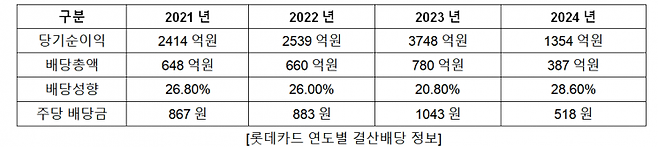 롯데카드의 배당 성향도 국내 상장기업 평균과 유사한 수준이었다. MBK와 우리은행, 롯데쇼핑으로 주주 변경 후 최근 4년 동안 배당성향은 20~28% 수준이었다. 대형 금융지주사 평균인 30% 이상보다 낮은 수치다.
