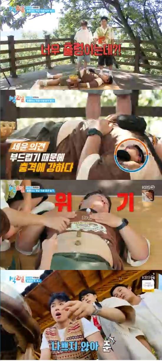 첫 주자로 나선 이준은 미션을 마치고 얼굴이 너무 아프고 어지럽다고 했다. 이어 유선호는 잘하려는 의욕이 앞서 이마를 찧고 말았다.