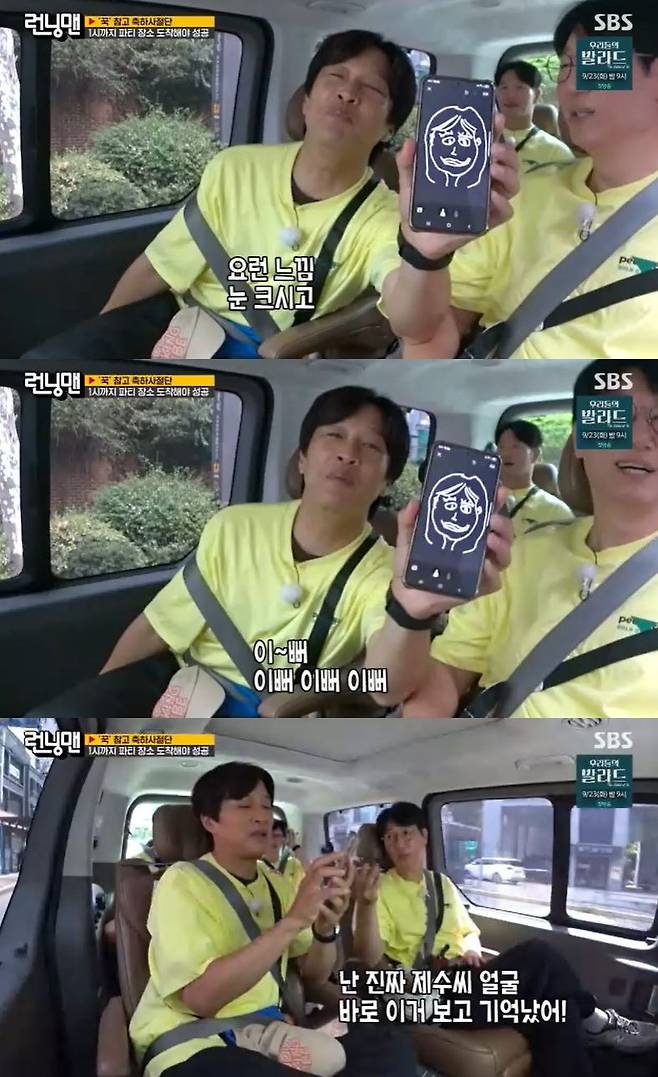 이어진 김종국의 타박에도 이들은 굴하지 않았고, 초상화를 그리는 차태현 옆에서 지석진은 "갸름해야 된다. 브이 라인이다"라고 조언했다.