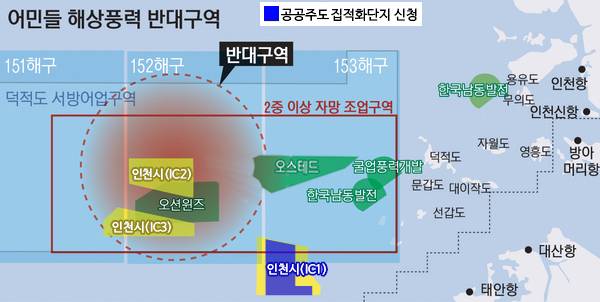 인천시는 원래 총 3개 입지(IC1·IC2·IC3)에 총 2천㎿ 규모 해상풍력단지를 계획했다. 이에 2개 입지(IC2·IC3)가 어민들의 주요 꽃게 어장과 겹치면서 반대 목소리가 나왔고, 결국 인천시는 입지를 1곳(IC1)으로 줄였다. 또 군사훈련지역 등을 고려해 해당 입지를 일부 축소해 발전용량을 1천227㎿에서 1천㎿로 조정했다.