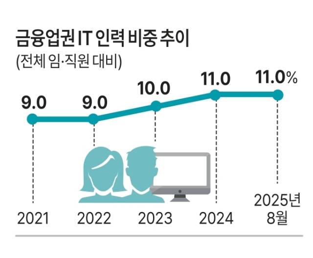 연도별로는 2021년 9%, 2022년 9%, 2023년 10%, 2024년 11%, 2025년 8월 11%로 증대되는 IT 기술과 업무 비중에 반해 평균 10% 수준에 정체돼 있다.