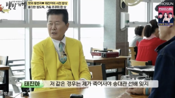 태진아는 "송대관 선배 이야기만 나오면 보고 싶다"라며 눈시울을 붉히기도 했다. 그는 "죽어서야 송대관 선배를 잊지. 계속 이렇게 마음 속에 있는 거다. 좋은 자리 맡아 놓으라고 얘기했다"라며 씁쓸히 웃었다.
