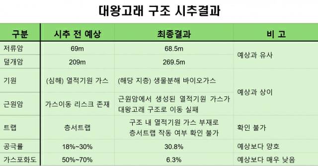 정밀분석 결과 사암층(약 70m)과 덮개암(약 270m), 공극률(약 31%) 등은 대체적으로 양호한 지하구조 물성을 확인했으나 회수 가능한 가스를 발견하지 못해 대왕고래 구조는 경제성이 없는 것으로 최종 확인했다.