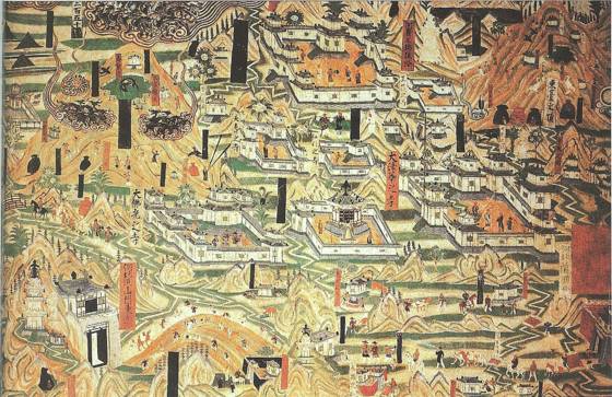 제일 먼저 성산이 된 산시성 우타이산은 최고 높이 3061m로 다섯 개의 평평한 봉우리가 둘러싼 신비로운 지형이다. 128개 사찰이 난립했던 전성기인 10세기 모습이 툰황 막고굴 벽화(사진)에 남아있다. 임제선의 창시자 임제선사가 “사기다, 우타이산에는 문수보살이 없다”고 폭로했으나 여전히 53개의 사찰이 현존하는 중국 최고의 불교 성지다.