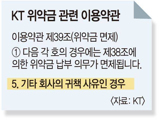 KT가 번호이동에 따른 위약금을 면제해야 한다는 지적은 이용약관에 그 근거가 있다. KT 이용약관 제39조 5항을 보면 KT 고객은 ‘기타 회사의 귀책 사유인 경우’가 인정되면 위약금 납부 의무가 면제된다. SK텔레콤도 비슷한 내용의 자사 약관에 따라 해킹 사태 이후 계약을 해지한 고객들의 위약금을 면제해 줬다.