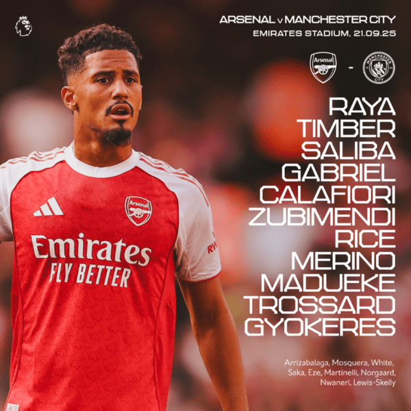 미켈 아르테타 감독이 이끄는 홈팀 아스널은 4-3-3 전형을 꺼내 들었다. 골문은 다비드 라야가 지켰고, 리카르도 칼라피오리-가브리엘-윌리엄 살리바-위리엔 팀버가 포백을 구성했다. 중원에는 데클란 라이스, 마르틴 수비멘디, 미켈 메리노가 나섰고, 최전방은 레안드로 트로사르, 빅토르 요케레스, 노니 마두에케가 스리톱을 형성했다.