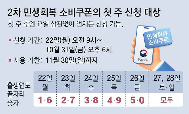 “22일 오전 9시부터 신청할 수 있다. 다만 신청 첫 주(22∼26일)에는 출생 연도 끝자리에 따라 신청 가능한 날짜가 다르다. 출생 연도 끝자리 1·6은 22일에, 2·7은 23일, 3·8은 24일, 4·9는 25일, 5·0은 26일에 신청할 수 있다. 예를 들어 2001년생이라면 22일에 신청하든지, 27일 이후에 신청해야 한다. 신청 마감은 10월 31일 오후 6시다.”