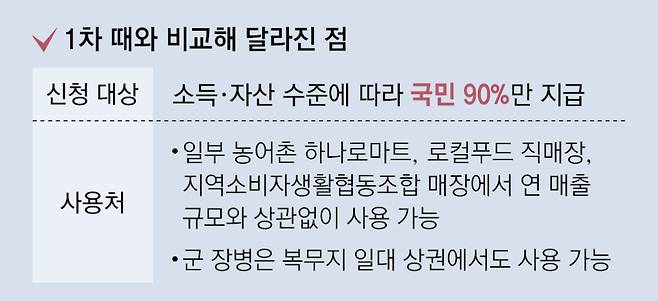 “1차 때와 마찬가지로 본인의 주소지 안에서 일부 업종을 제외한 연 매출 30억 원 이하 소상공인 업체에서 쓸 수 있다. 이에 더해진 점이 있다면 소비 여건이 열악한 일부 읍면 지역 하나로마트와 로컬푸드 직매장에서 사용할 수 있다. 법인 소재지와 매장 소재지가 일치하는 지역소비자생활협동조합 매장도 연 매출 규모와 상관없이 쿠폰을 받는다. 의무복무 중인 군 장병은 주민등록상 주소지가 아닌 복무지 관할 행정복지센터에서 소비쿠폰을 신청하고, 해당 지역에서 사용 가능한 선불카드를 받을 수도 있다.”