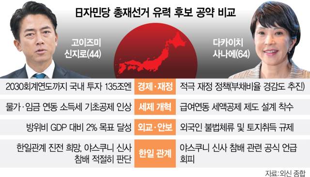 21일 현지 언론에 따르면 이번 선거에는 다카이치 사나에 전 경제안보담당상, 고이즈미 신지로 농림수산상, 하야시 요시마사 관방장관, 고바야시 다카유키 전 경제안보담당상, 모테기 도시미쓰 전 자민당 간사장이 출마해 5파전으로 치러집니다. 이번 선거의 양강 후보로는 고이즈미 농림수산상과 다카이치 전 경제안보상이 꼽힙니다.