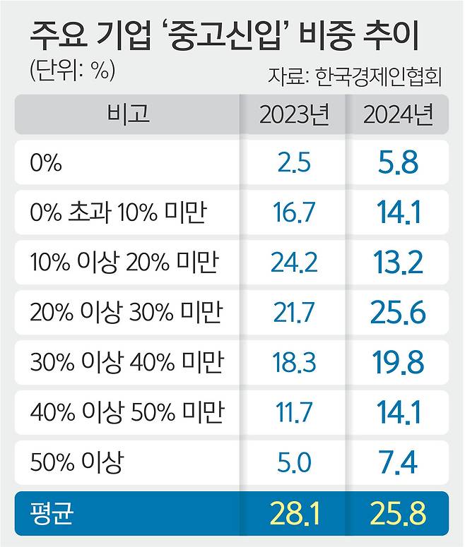 21일 한국경제인협회(한경협)가 매출액 상위 500대 기업(121개사 응답)을 대상으로 실시한 '2025년 하반기 주요 대기업 대졸 신규채용 계획 조사'에 따르면 지난해 대졸 신입사원 28.1는 경력이 있던 중고 신입이었다.