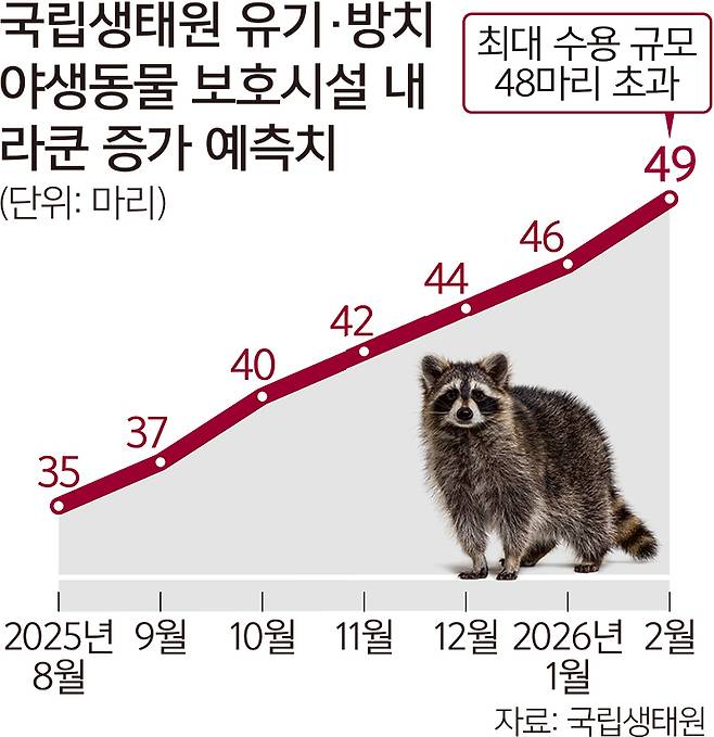 라쿤의 경우 안전 관리 차원에서 공간당 최대 8마리만 수용할 수 있다. 포유류 사육 공간을 모두 활용할 경우 최대 48마리가 한계란 뜻이다.