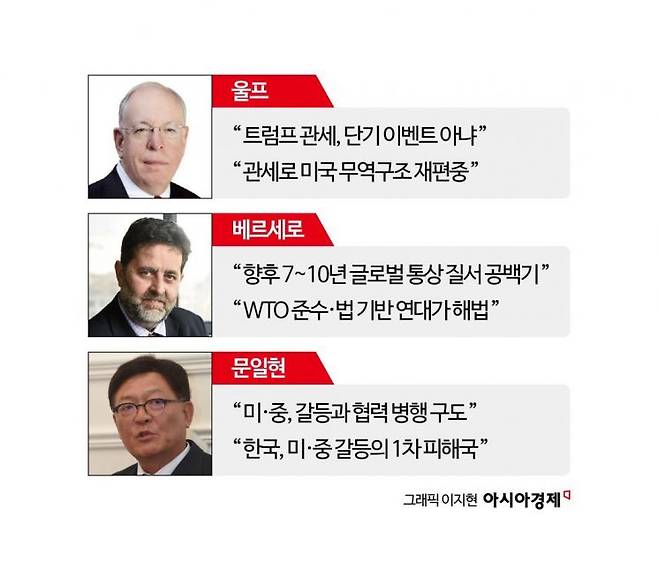 아시아경제는 세계 무역질서가 현재 어떤 국면에 서 있는지, 그리고 앞으로 어디로 향할지 진단하기 위해 국제통상 전문가들을 인터뷰했다. 미국 통상 관료 출신으로 WTO 사무부총장을 지낸 앨런 울프 피터슨국제경제연구소(PIIE) 선임연구원, 유럽연합(EU) 집행위원회에서 30년 이상 몸담으며 한국·EU 자유무역협정(FTA) 수석 협상가를 지낸 이그나시오 가르시아 베르세로 브뤼겔연구소 비상임 펠로우, 그리고 문일현 중국정법대 교수와의 서면·전화 인터뷰 등을 통해 미국 관세정책의 지속 여부와 그 파급 효과, 각국의 대응 전망 등을 진단했다.