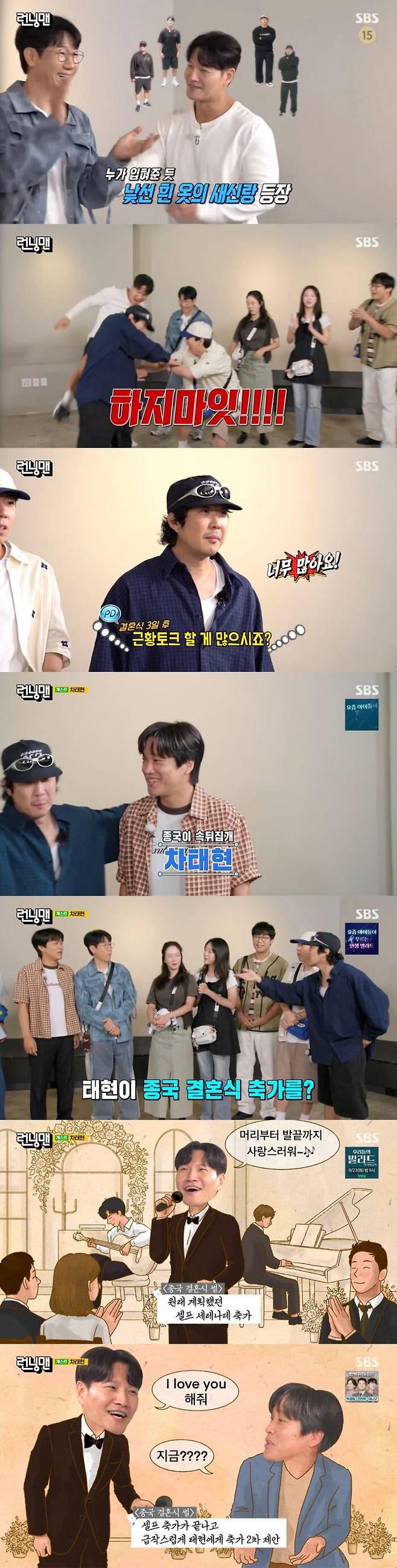 - '런닝맨' 하하-양세찬, "차태현의 김종국 결혼 축가에 감동받아 눈물···김종국 셀프 축가 최고"