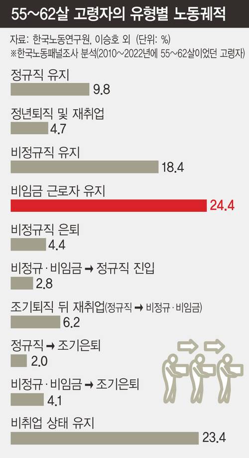 이승호 한국노동연구원 연구위원은 60살 전후 고령자의 노동 궤적을 10가지 유형으로 구분해 분석했다. 한국노동패널조사를 활용해 2010~2022년에 55~62살을 경험한 이들의 노동시장 지위(그래픽 참조)를 살펴본 것이다. 정년까지 정규직 노동자 지위를 유지한 집단 규모는 대략 14.5%(정규직 유지+정년퇴직 및 재취업)에 불과하다. 최근 출생 코호트(같은 시기에 태어난 인구 집단)일수록 비중이 높아지는 경향을 보이고 있어 현재 시점에서 분석하면 20% 안팎으로 추정된다고 연구진은 설명했다.