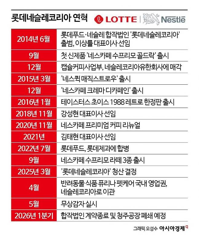 롯데와 네슬레가 손을 잡고 출범했던 합작사 롯데네슬레코리아가 청산 절차에 들어갔다. 2014년 출범 당시 '글로벌 식품 공룡'과 '국내 유통 강자'가 만났다는 점에서 시장의 주목을 받았다. 하지만 한국 인스턴트커피 시장의 높은 벽을 끝내 넘지 못하고 11년 만에 적자와 함께 막을 내리게 됐다.