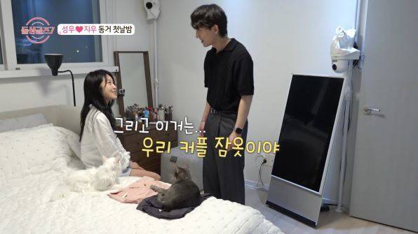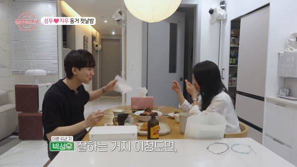 식사 후 성우는 지우에게 LP판을 선물했고, “크리스마스 때 꼭 같이 듣자”고 달달하게 말했다. 다음 날 출근해야 하는 지우를 위해 잠자리에 든 두 사람은 한 침대에서 서로의 얼굴을 사랑스럽게 바라봤다. 그러다 지우가 잠이 들자 성우는 불을 끄면서 동거 첫날을 로맨틱하게 마무리했다.