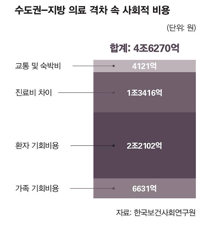 해마다 수도권과 지방 간 의료 격차 속에 발생하는 사회적 비용은 4조원이 넘는다. 한국보건사회연구원이 올해 6월 발표한 보고서에 따르면, 국립대병원 대신 서울 상급종합병원을 이용함에 따라 추가로 드는 비용은 연간 최대 4조6270억원으로 추산됐다. 숙박비와 교통비만 합해도 4121억원, 병원 간 진료비 차이를 고려한 비용은 1조3416억원이다. 여기에 환자 및 가족의 기회비용 총 2조8733억원까지 추가됐다.