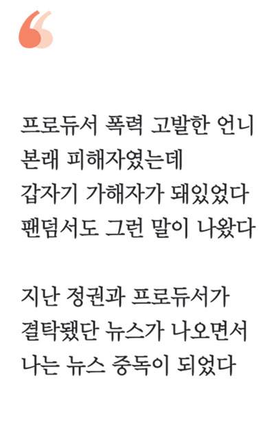 언니들의 음악이 프로듀서들에 의해 만들어진 거라고, 그러므로 그 프로듀서들이 없다면 언니들은 아무것도 아닐 거라는 말도 나를 얼마나 아프게 했었는지. 프로듀서에게 당한 폭력을 고발하는 언니를 같은 그룹의 다른 언니들까지 외면하고, 언니만 빠지면 아무 문제가 없다는 듯 구는 그 언니들이 또 나를 얼마나 다치게 만들었는지. 고발하는 아이돌이라는 선례를 만들지 않겠다는 듯, 언니의 학폭과 스태프 갑질 문제를 더 깊고 집요하게 파고들었던 언론. 언니는 본래 피해자였는데 갑자기 가해자가 되어 있었다. 그리고 팬덤에서도 그런 말이 나오기 시작했다. 언니가 가해자 같아 보이는 ‘언어들’을 사용한다고.