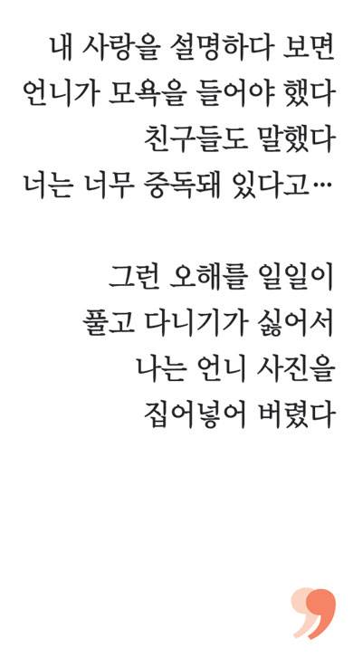 지난 정권과 언니를 괴롭힌 프로듀서가 결탁되어 있다는 뉴스가 나오기 시작하면서부터 나는 뉴스 중독이 되었다. 특검이 발표할 때마다 나는 귀를 쫑긋 기울였다. 나도 안다. 그 사람의 추함이 드러난다고 해서 언니가 복권되는 일은 없다는 것을. 언니는 버려진 사람이니까. 같은 멤버들과 팬덤에게까지. 나는 내 사랑을 거두지 않았다는 표시로, 저항의 의미로 언니 사진을 달고 다녔지만, 내 사랑을 설명하다 보면 오히려 언니가 더 많은 모욕을 들어야 했다. 친구들도 내게 말했다. 너는 너무 중독되어 있다고. 중독이란 비의지적인 거라고. 그런 오해를 일일이 풀고 다니기가 싫어서 나는 언니 사진을 집어넣어 버렸다.