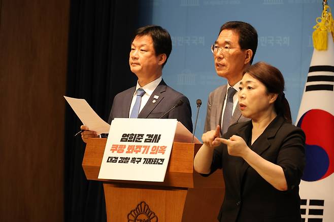국회 법제사법위원회 소속 박균택 의원은 22일 오전 국회 소통관에서 기자회견을 열고 "쿠팡 사건을 의도적으로 덮어줬다는 의혹이 제기되고 있는 엄희준 검사에 대하여 대검의 신속한 감찰 착수를 촉구하기 위해 이 자리에 섰다"라고 밝혔다.