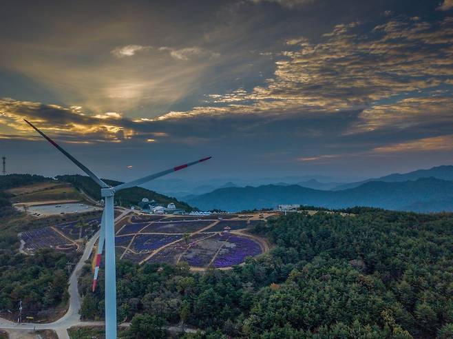 [여긴 어디] 산 위 거대한 풍차 너머 노을 물든 보랏빛 융단