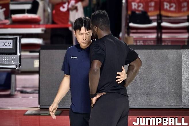 경기 전, SK 자밀 워니와 삼성 김효범 감독이 뜻밖의(?) 대화를 나눴다.