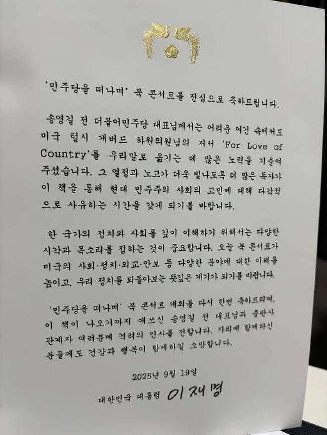 ◇ 김현정> 송영길 북 콘서트에 축전을 보낸 이재명 대통령. 지금 골라오신 화면은 저게 축전인가 봐요.