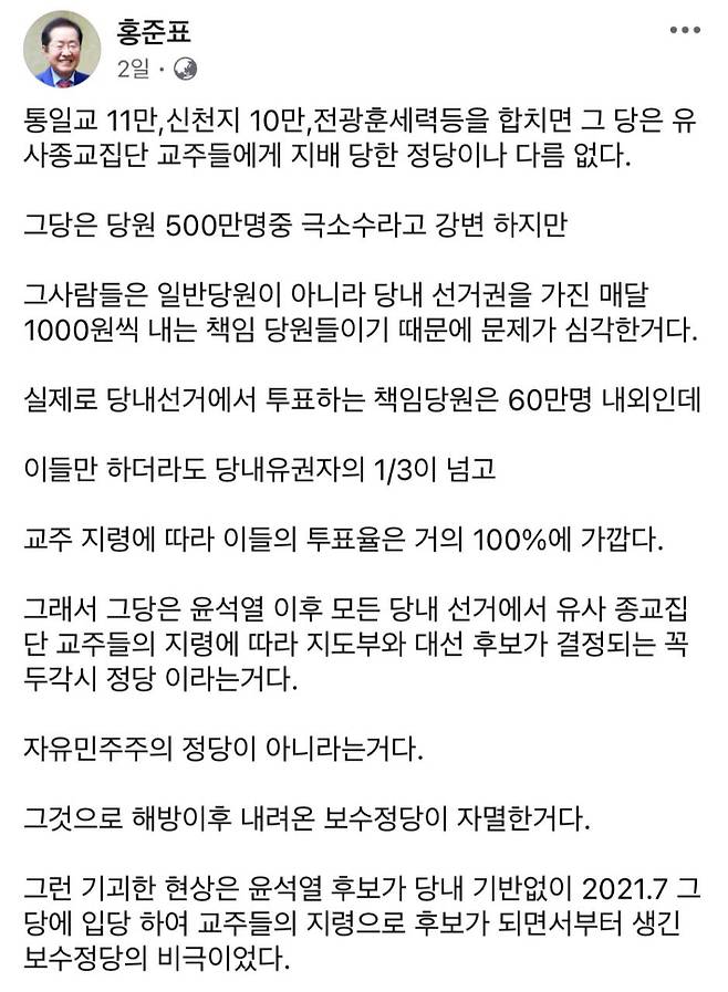 ◇ 김현정> 유사 종교 집단의 문 연 국민의힘 하면서 골라오신 자료는 홍준표 전 대구시장의 SNS를 골라오셨는데 제가 한번 읽어보겠습니다. 통일교 11만, 신천지 10만 전광훈 세력 등등을 합치면 그 당은 유사 종교 집단 교주들에게 지배당한 정당이나 다름없다. 쭉쭉 긴 문장의 SNS, 저게 어제 쓴 건가요? 홍 시장이?