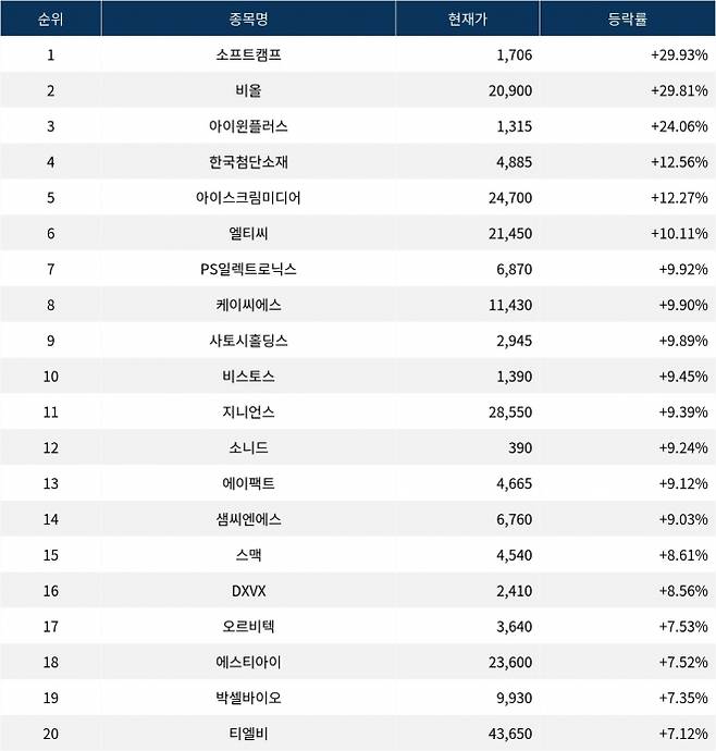 이어 상승률 2위 비올(335890)은 현재가 20,900원으로 주가가 29.81% 폭등하고 있다. 상승률 3위 아이윈플러스(123010)는 현재 1,315원으로 24.06% 폭등하며 호조를 보이고 있다. 상승률 4위 한국첨단소재(062970)는 12.56% 급등하며 4,885원에 거래되고 있다. 상승률 5위 아이스크림미디어(461300)는 12.27%의 상승세를 보이며 24,700원에 거래되고 있다.
