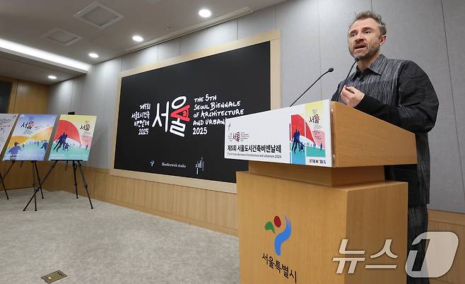 (서울=뉴스1) 허경 기자 = 토마스 헤더윅 비엔날레 총감독이 22일 서울시정에서 열린 제5회 서울도시건축비엔날레 간담회에서 주제 및 전시내용을 발표하고 있다. 2025.9.22/뉴스1