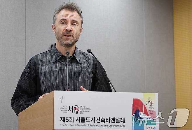(서울=뉴스1) 허경 기자 = 토마스 헤더윅 비엔날레 총감독이 22일 서울시정에서 열린 제5회 서울도시건축비엔날레 간담회에서 주제 및 전시내용을 발표하고 있다. 2025.9.22/뉴스1