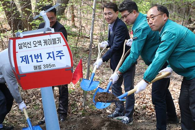 | ▲ 지난 4월 24일 오후 강원도와 양양군 관계자 등이 강원 양양군 서면에서 설악산 오색케이블카 1번 지주가 들어설 곳에 첫 삽을 뜨고 있다. |