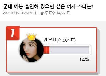 최근 커뮤니티 포털사이트 디시인사이드(대표 김유식)가 '군대 예능 출연해 줬으면 싶은 여자 스타는?'으로 투표를 한 결과 권은비가 1위에 올랐다.