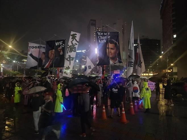 보수 성향의 단체들이 19일에도 서울 도심에서 최근 피살된 미국의 우파 활동가 찰리 커크의 사진을 들고 '혐중 시위'를 벌였습니다.
