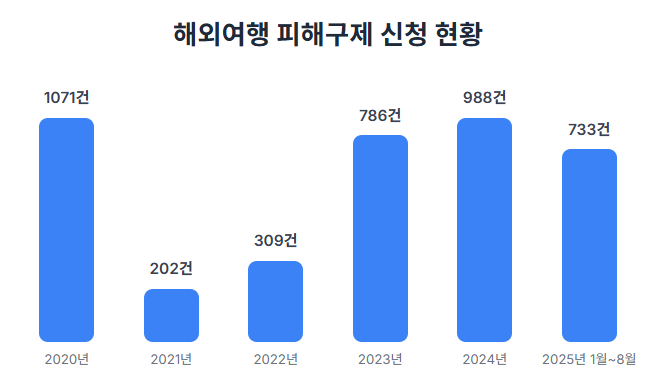 22일 국회 정무위원회 소속 이양수 국민의힘 의원이 한국소비자원으로부터 제출받은 자료에 따르면 지난 2020년부터 올해 8월까지 최근 5년간 소비자원에 접수된 해외여행 피해구제 신청은 총 4039건으로 집계됐다. 코로나19 사태가 한창이던 2020년에만 1071건이 접수됐고 2021년에는 202건, 2022년 309건으로 주춤했지만 사회적 거리두기 해제로 해외여행 수요가 살아나면서 이후 다시 증가하는 추세다. 2023년에는 786건, 지난해 988건으로 크게 늘었으며 올해는 1~8월에만 733건에 달해 연말까지는 작년 수치를 넘어설 것으로 예상된다.