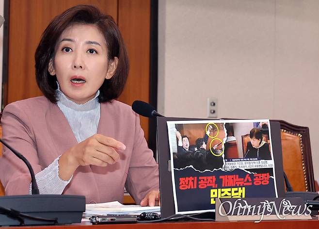 | ▲ '가짜뉴스 공장 민주당' 써붙인 나경원 나경원 국민의힘 의원이 22일 국회 법제사법위원회 전체회의에서 모니터에 내건 피켓을 추미애 국회 법제사법위원장의 명령으로 국회 직원들이 철거하려하자 강하게 저항하고 있다. |