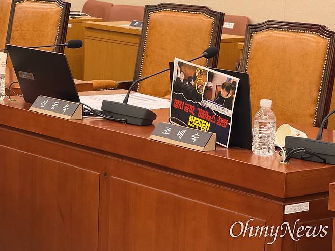 갈등의 시작은 국민의힘 의원들이 내건 유인물이었다. 이들은 법사위 전체회의 개회 전부터 '정치공작, 가짜뉴스 공장 민주당'이라는 구호가 적힌 유인물을 명패 뒤에 비치했다. 추미애 위원장은 "국민의힘 의원들은 회의진행에 방해가 되는 불법유인물을 철거해주시고, 법사위 행정직원들은 채증해주기 바란다"고 밝혔다.
