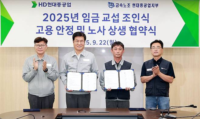 (울산=연합뉴스) 22일 울산 HD현대중공업 본사에서 열린 임금교섭 조인식에서 이상균 HD현대중공업 사장(왼쪽 두 번째부터)과 백호선 현대중공업 노조지부장이 임금협상 합의안에 서명한 뒤 기념 촬영하고 있다. 2025.9.22 [HD현대중공업 제공. 재판매 및 DB 금지]