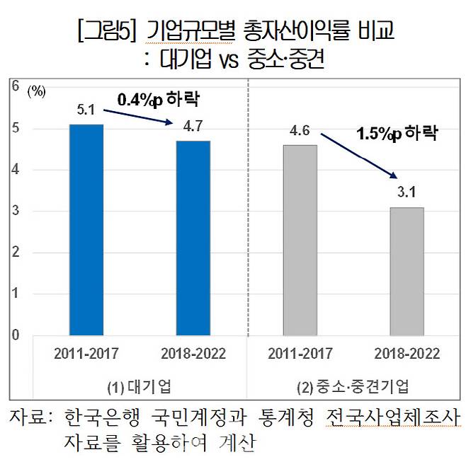 실제 SGI 분석에 따르면 노동집약적 기업의 총자산이익률(ROA)은 2018년 전후 1.8%포인트 떨어져 자본집약적 기업보다 더 크게 하락했다. 기업 규모별로는 중소·중견기업이 1.5%포인트 내렸다. 대기업(0.4%포인트 하락)에 비해 훨씬 큰 폭의 하락을 보인 것이다.