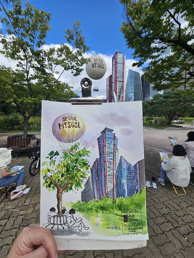 무엇보다도 인상 깊었던 건 날씨였다. 행사 전날까지 이어지던 잔잔한 빗줄기는 어느새 그치고, 여의도 하늘은 거짓말처럼 맑게 갰다. 푸른 하늘 아래 스케쳐들은 저마다 자리를 찾아 도시를 그려나갔다.