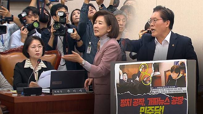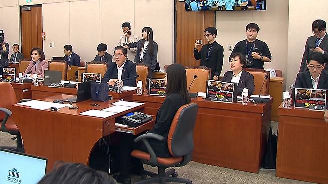국민의힘 소속 법사위원들은 청문회 시작 전부터 회의장에 설치된 노트북에 '정치 공작, 가짜뉴스 공장 민주당!'이라는 글귀와 서영교 의원의 사진 등이 담긴 게시물을 부착했습니다.