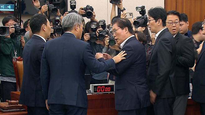 이에 대해 추미애 법사위원장이 철거를 요청했으나 국민의힘 의원들이 이에 불응하면서 혼란이 거듭 됐습니다.