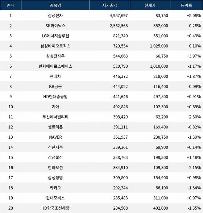 한편 시가총액 20위권 종목들은 두산에너빌리티(034020) ▲2.30%, 셀트리온(068270) ▼0.82%, NAVER(035420) ▼1.39%, 신한지주(055550) ▲0.14%, 삼성물산(028260) ▲1.48%, 한화오션(042660) ▼2.15%, 삼성생명(032830) ▲0.98%, 카카오(035720) ▼1.34%, 현대모비스(012330) ▲0.97%, HD한국조선해양(009540) ▼1.35% 등의 성적을 기록하고 있다.