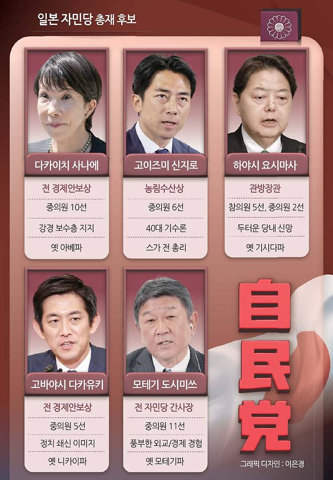 현재 자민당 차기 총재 가능성으로 보면, 다카이치가 ‘젊은 우파’ 고이즈미 신지로(44) 농림수산상을 넘어선 모양새다. 지난 13~14일 요미우리신문이 실시한 여론조사에서 ‘차기 총재로 가장 적합한 인물’로 다카이치 전 경제안보상이 29%의 지지를 얻으며, 고이즈미 농림수산상(25%)을 앞섰다.