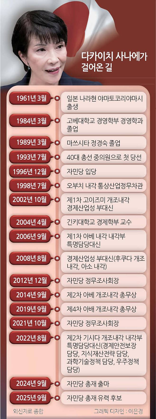 다카이치의 이력은 남성적이고 보수적이며 폐쇄적 파벌 논리로 작동하는 일본 정계를 생각하면, 말 그대로 파격적이다. 10선을 한 베테랑 정치인인 그는 ‘일본의 철의 여인’으로 불리길 원한다.