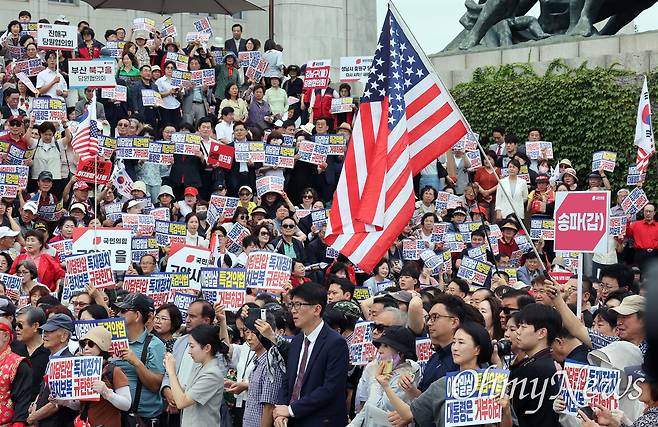 | ▲ 성조기 등장한 국힘 규탄대회 국민의힘이 12일 서울 여의도 국회 본관 앞 계단에서 연 야당탄압 독재정치 규탄대회에서 일부 참가자들이 태극기와 성조기를 흔들고 있다. |