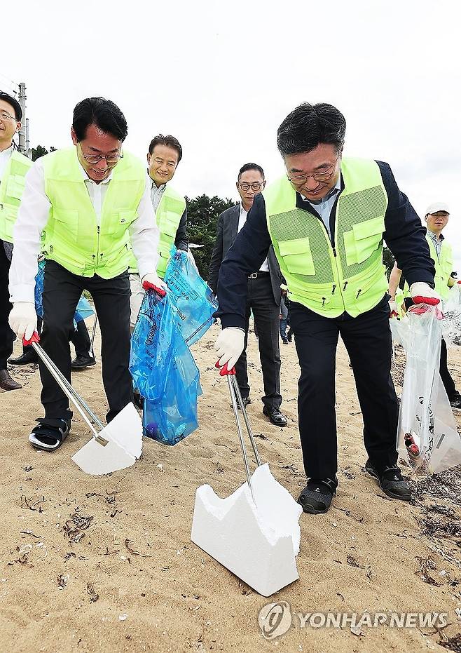 (화성=연합뉴스) 홍기원 기자 = 22일 경기도 화성시 궁평항에서 열린 '대한민국 새단장' 행사에서 윤호중 행정안전부 장관, 정명근 화성시장 등 참석자들이 쓰레기를 줍고 있다. 2025.9.22
